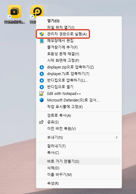 바탕화면의 LD플레이어 아이콘을 우클릭한 후, [관리자 권한으로 실행]을 클릭하여 플레이어를 켜주세요.