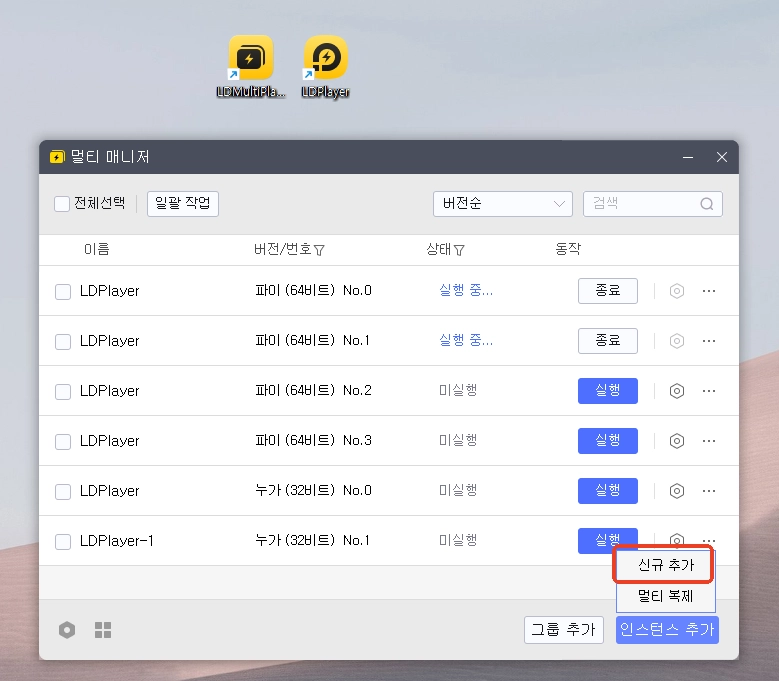 바탕화면의 LD 멀티플레이어(LDMultiPlayer)를 실행하여 '신규 추가' 버튼을 눌러 새로운 인스턴스를 생성해 주세요.